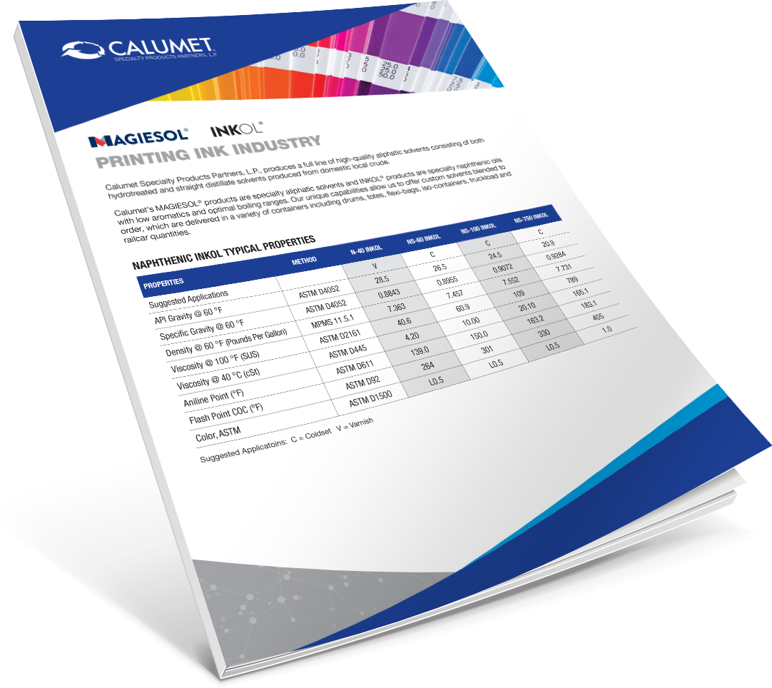 Calumet offers specialty aliphatic solvents and specialty naphthenic oils with low aromatics and optimal boiling ranges for potent and superior ink properties. Our unique capabilities allow us to offer custom solvents blended to order.